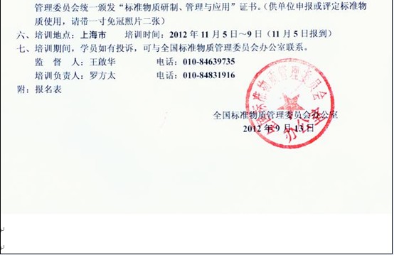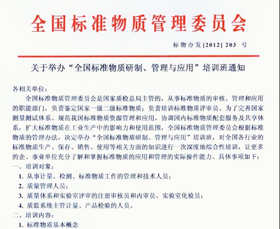 關于舉辦“全國標準物質研制、管理與應用培訓班”的通知