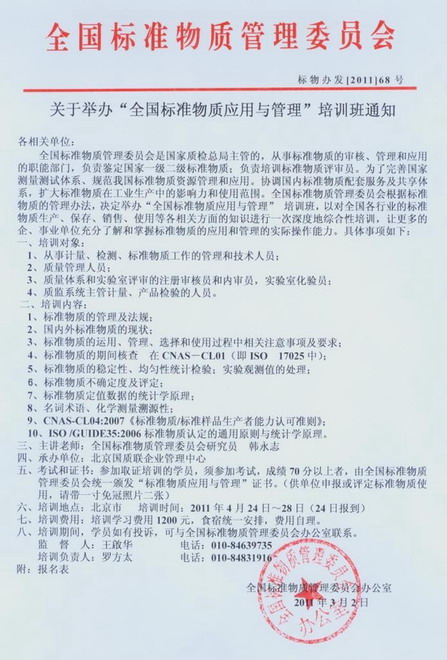關于舉辦“全國標準物質應用與管理”培訓班的通知
