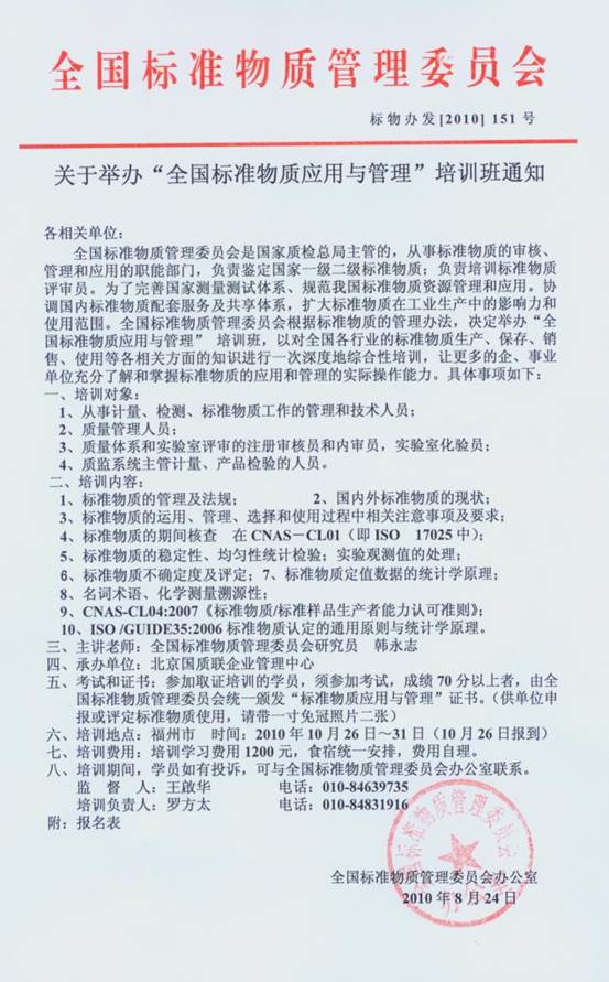 關于舉辦“全國標準物質應用與管理”培訓班的通知