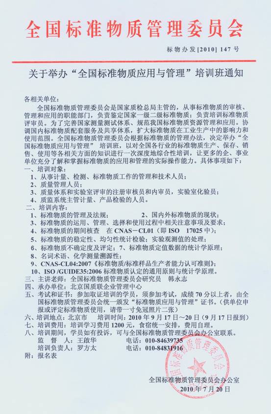 關于舉辦“全國標準物質應用與管理”培訓班的通知