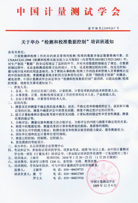 關(guān)于舉辦“檢測和校準(zhǔn)數(shù)據(jù)控制培訓(xùn)班”的通知