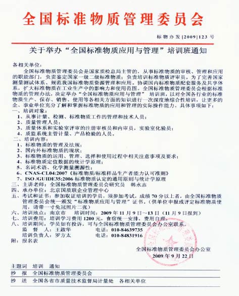 關于舉辦“全國標準物質應用與管理”培訓班的通知