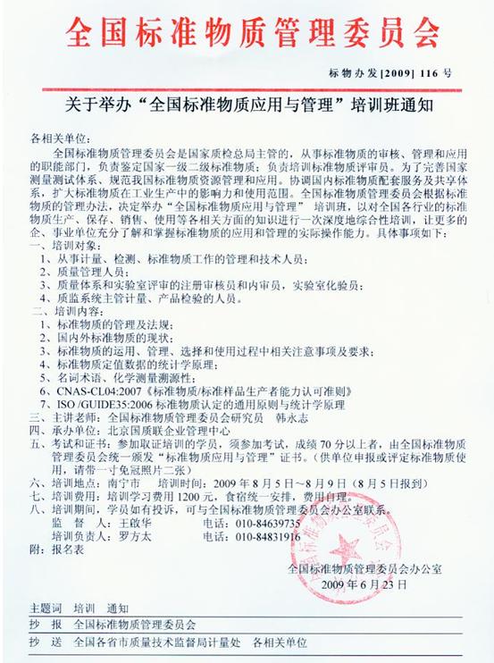 關于舉辦“全國標準物質應用與管理”培訓班的通知