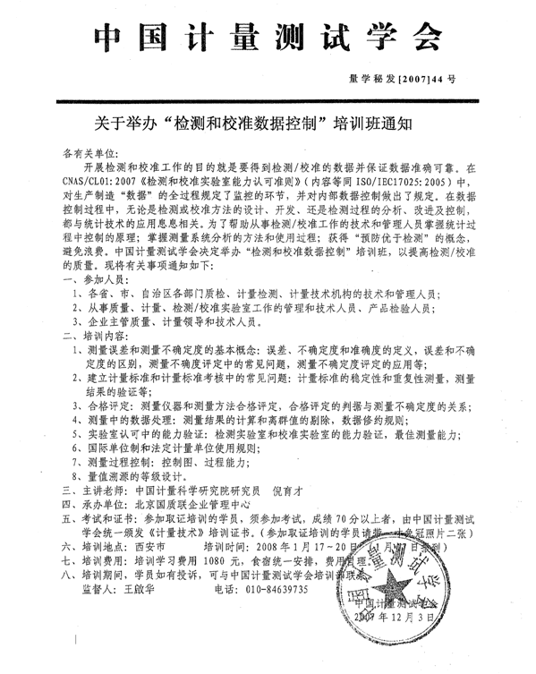 關于舉辦“檢測和校準數據控制”培訓班的通知