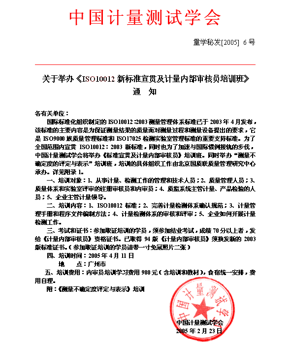 關(guān)于舉辦《ISO10012新標(biāo)準宣貫及計量內(nèi)部審核員培訓(xùn)班》通知(2005.04.11 廣州)