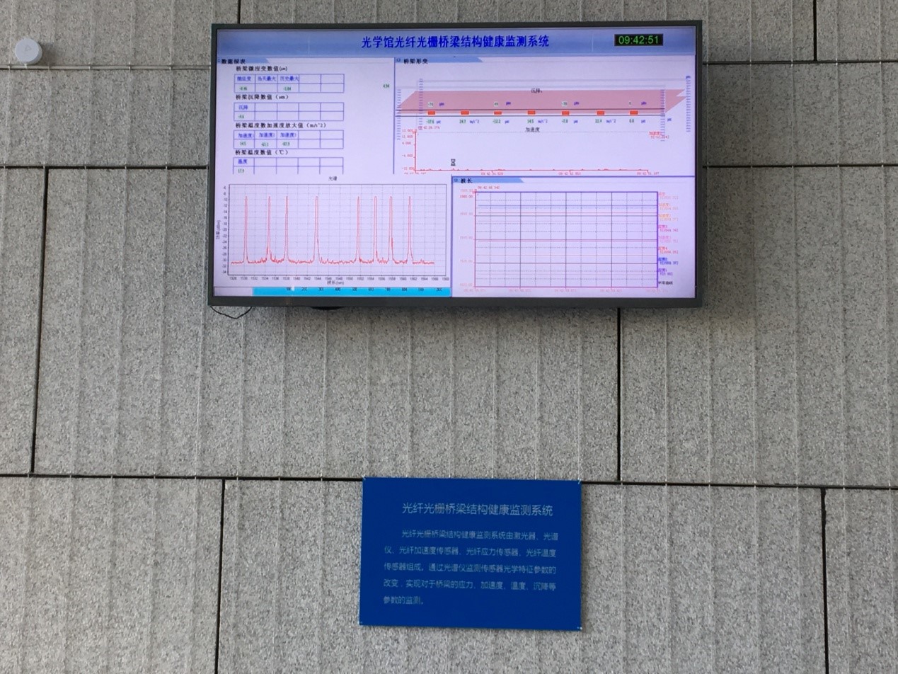 作為中國計量測試學會的科普教育基地,我館始終將光學與計量測試結合作為展項展示的一個重要方向。2017年我館在館內利用過道走廊借助光纖光柵監測技術,對過道走廊進行結構進行監測,在走廊側面,平均分布安裝10個光纖光柵應變傳感器和一個溫度傳感器,光纖光柵解調儀安裝在橋梁側面狹小空隙內,不影響橋梁美觀。當有游客經過橋梁時,傳感器閃爍顯示行人位置,紅色模擬塊上下拉伸表現應變值變化,橋梁分為10個區域,每個區域畫面根據應變和沉降數值上下浮動。我館合作開發的光纖光柵橋梁結構健康監測系統展項于2017年底設計施工完成,2018年正式投入使用,運行期滿一年,運行期間受到廣泛好評。