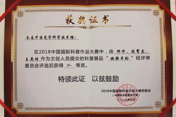 2018年9月16日,由世界公眾科學素質促進大會組委會主辦,中國科技館、中國科技館發展基金會、中國自然科學博物館學會承辦的“2018中國國際科普作品大賽”圓滿落下帷幕,長春中國光學科學技術館原創光學科普展品《旋轉車輪》榮獲科普展品二等獎。