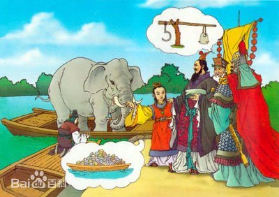 有一次,吳國孫權送給曹操一只大象,曹操十分高興。曹操對大家說:“這只大象真是大,可是到底有多重呢?你們哪個有辦法稱它一稱?”大臣們都紛紛議論開了。大臣們想了許多辦法,一個個都行不通。可真叫人為難呀。這時,曹沖說他有辦法,只見他趴在曹操耳邊,輕聲地講了起來。曹操一聽連連叫好,吩咐左右立刻準備稱象,然后對大臣們說:“走!咱們到河邊看稱象去!”眾大臣跟隨曹操來到河邊。河里停著一只大船,曹沖叫人把象牽到船上,等船身穩定了,在船舷上齊水面的地方,刻了一條線。再叫人把象牽到岸上來,把大大小小的石頭,一塊一塊地往船上裝,船身就一點兒一點兒往下沉。等船身沉到剛才刻的那條線和水面一樣齊了,只要把船里的石頭都稱一下,把重量加起來,就知道大象有多重了。